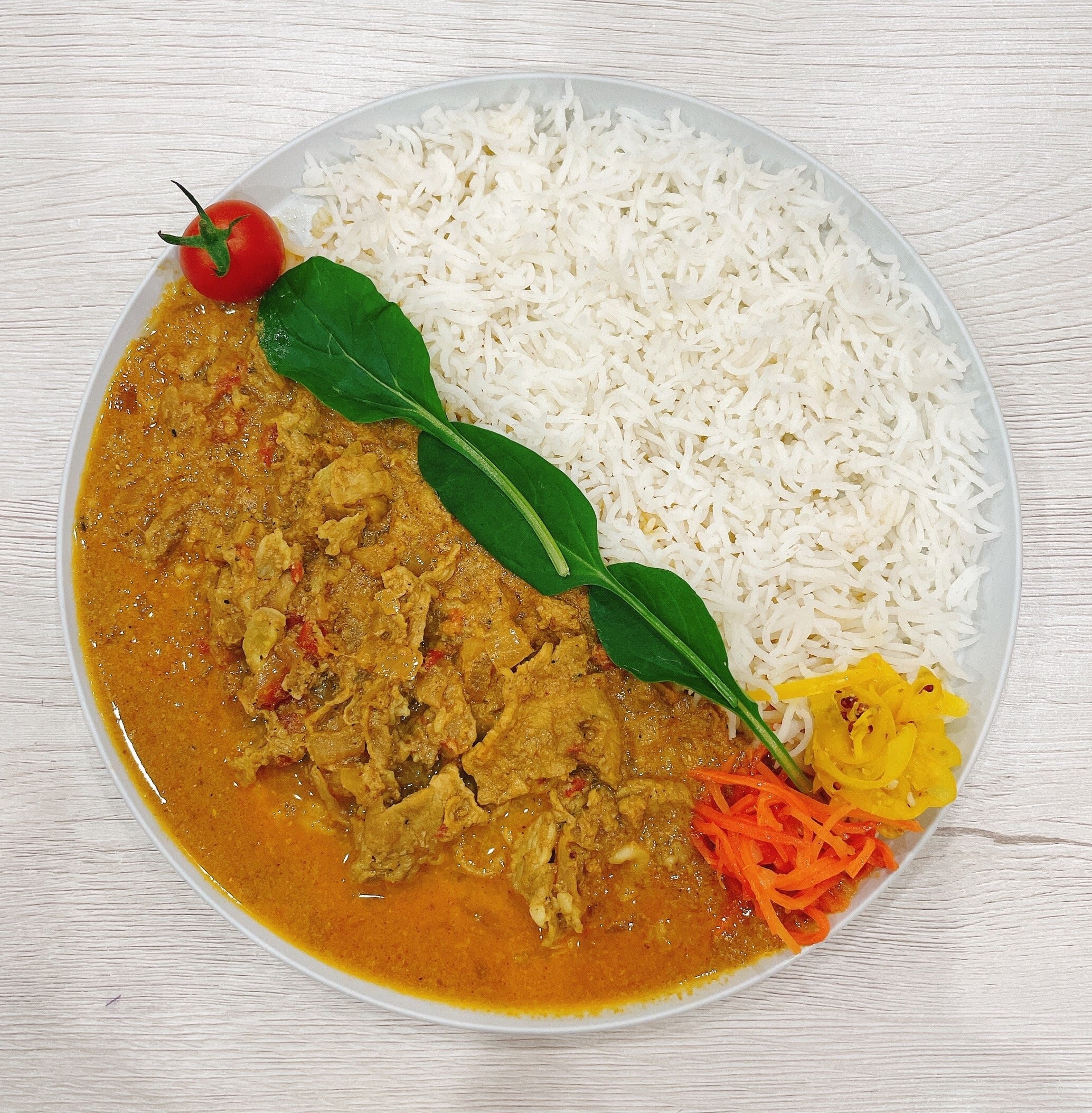 スパイスに漬けこんだ豚こま肉がご飯と絡む少し酸味の効いたカレー。ブラックペッパーと青唐辛子の爽やかな辛味をココナッツミルクですこしまろやかに仕上げています。辛味、甘味、酸味のバランスが特徴的なカレーです。